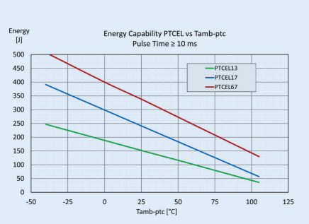 Figure 3: This graph illustrates the energy capability of three different Vishay PTCEL thermistors (PTCEL13, PTCEL17, and PTCEL67) as a function of ambient temperature for pulse times greater than or equal to 10ms. (Source: Vishay)