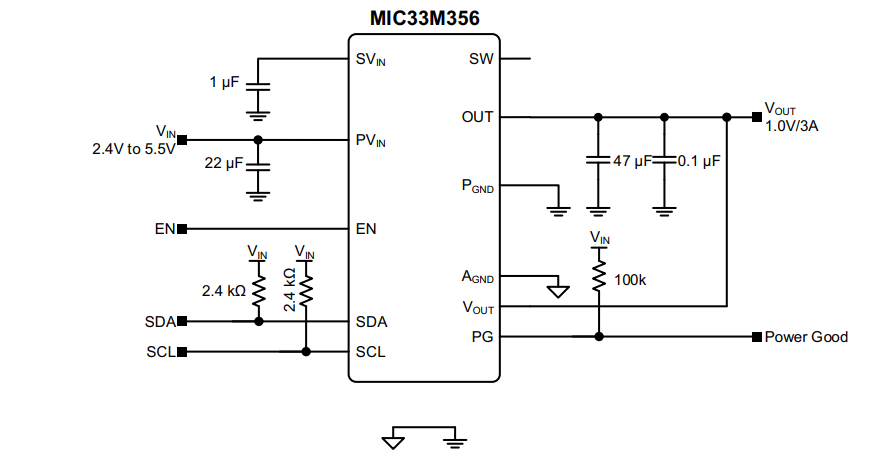 L'interfaccia I2C MIC33M356 consente di programmare la tensione di uscita tra 0,6 V e 1,28 V, con una risoluzione di 5 mV (-HAYMP e -FAYMP) o tra 0,6 V e 3,84 V, con una risoluzione di 10 mV e 20 mV (-SAYMP). Sono disponibili due diverse opzioni di tensione predefinita (0,9 V e 1,0 V) in modo che l'applicazione possa essere avviata con un livello di tensione sicuro e quindi spostata in modalità ad alte prestazioni sotto controllo I2C.