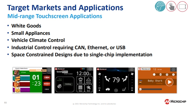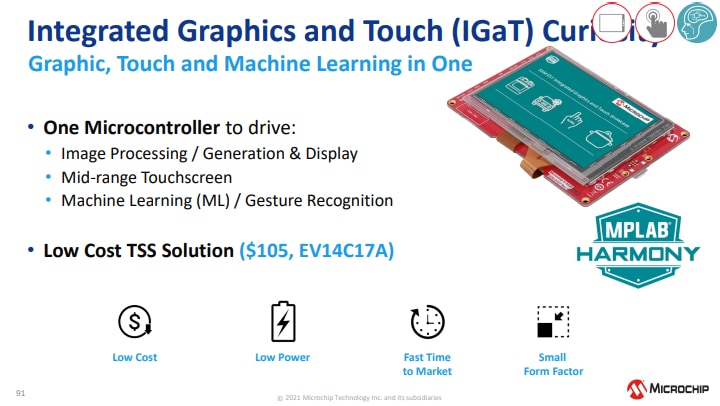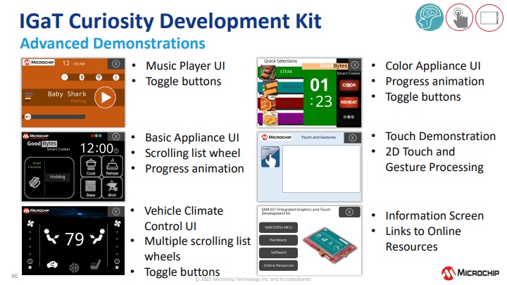 Il Kit di valutazione Curiosity Touch e grafica integrata (IGaT) SAM E51 di Microchip Technology è una piattaforma hardware per valutare il microcontroller SAME51J20A. Il kit integra uno schermo tattile completo, una grafica TFT e una superficie tattile in una soluzione a chip singolo. È supportato dall'ambiente di sviluppo integrato (IDE) MPLAB® X. Il kit fornisce un facile accesso alle funzionalità del SAME51J20A per integrare il dispositivo in un progetto personalizzato. Il kit di valutazione Curiosity Touch e grafica integrata include un debugger integrato. Non sono necessari strumenti esterni per programmare il dispositivo SAME51J20A.Caratteristiche